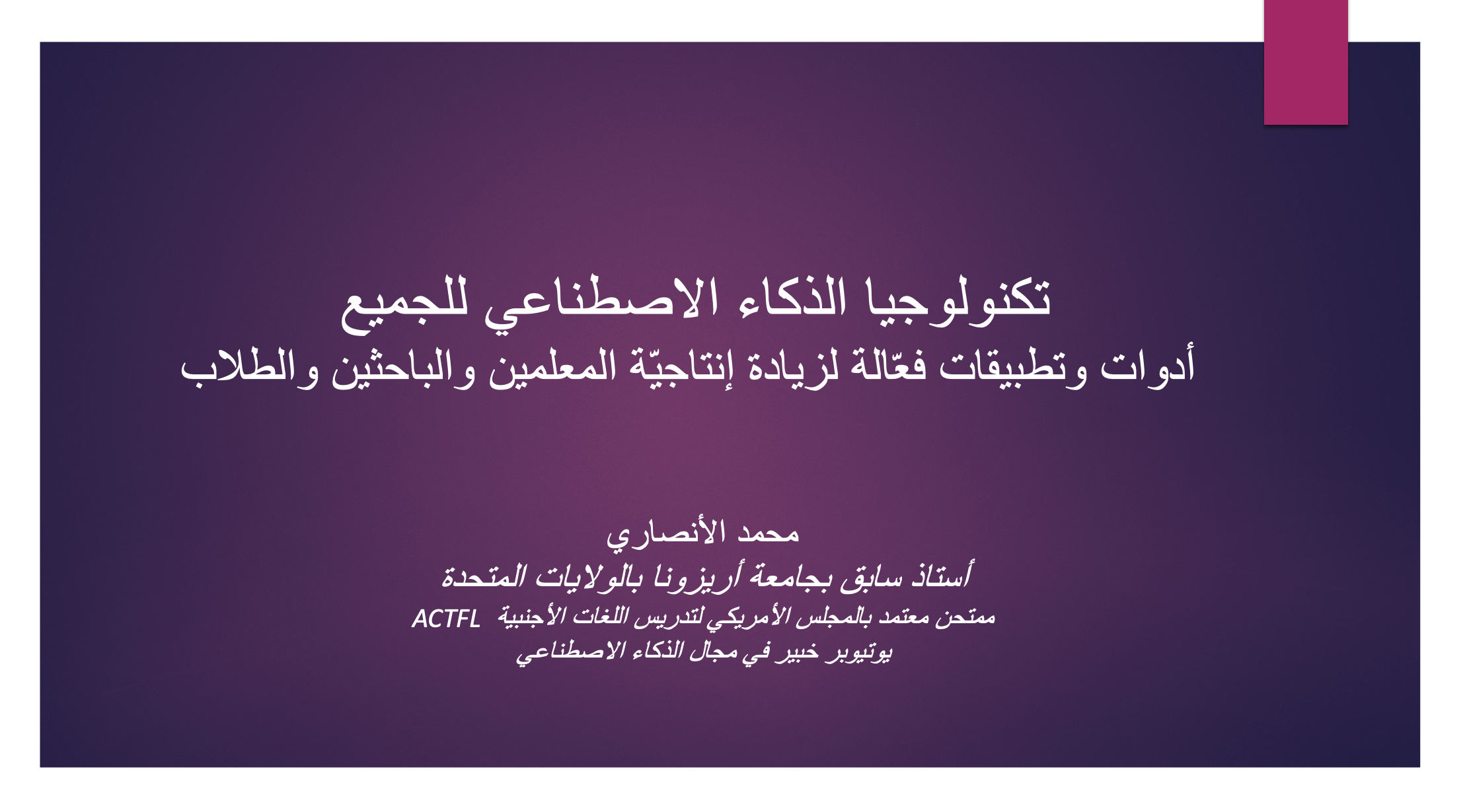 ورشة عمل: تكنولوجيا الذكاء الاصطناعي للجميع: أدوات وتطبيقات فعّالة لزيادة إنتاجيّة المعلمين والطلاب والباحثين