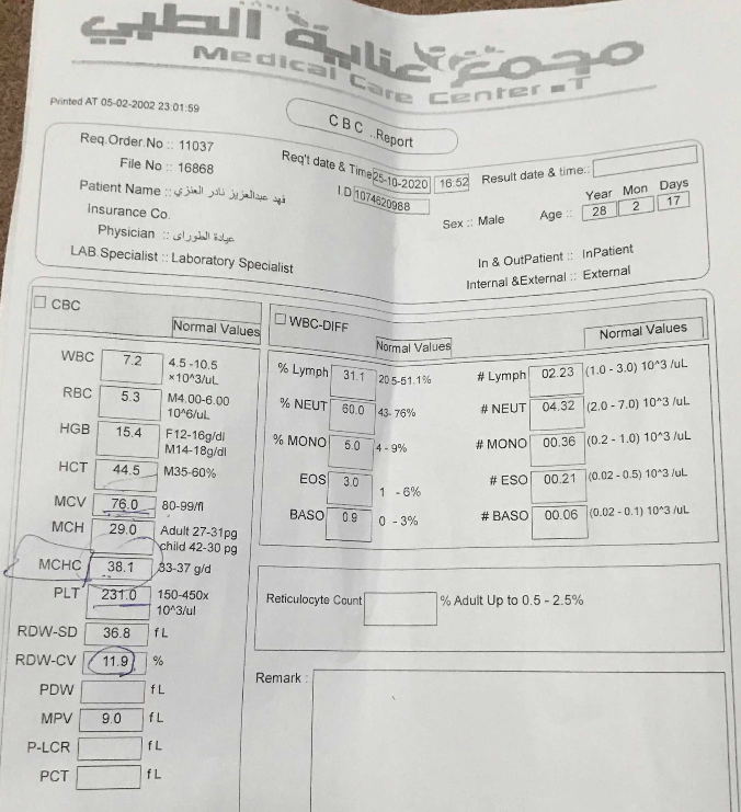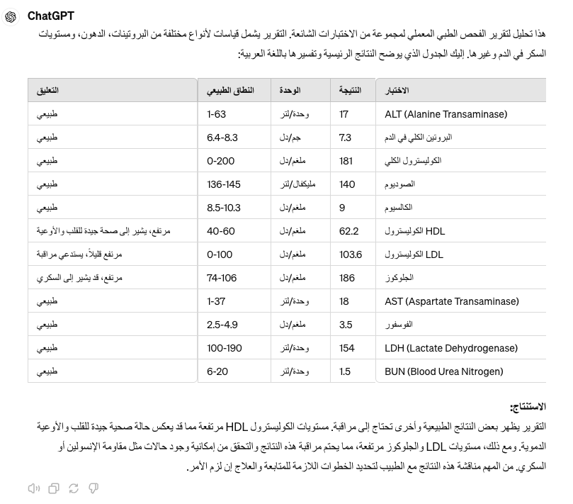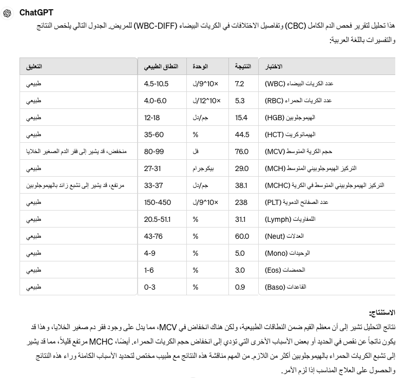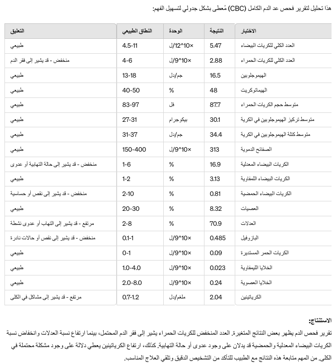 Prompt: Please provide a detailed analysis and explanation of this laboratory report in simple language. Include a summary of key points and findings in a table. Write the report in Arabic, concisely and directly.